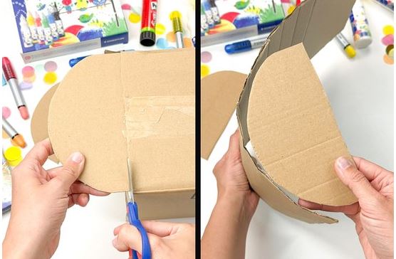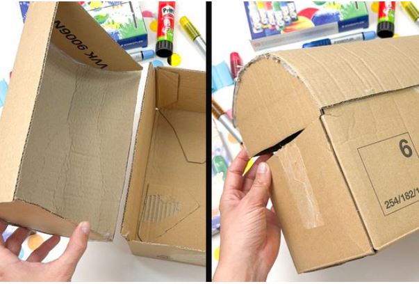 1. Kerekítsük le egy kartondoboz rövid oldalait, majd ragasszuk őket egy hosszabb kartonlap két szélére, ami később fedélként fog működni.