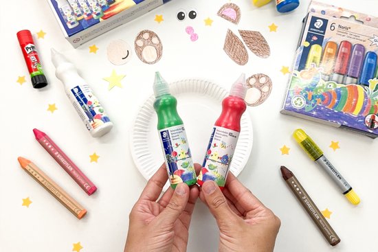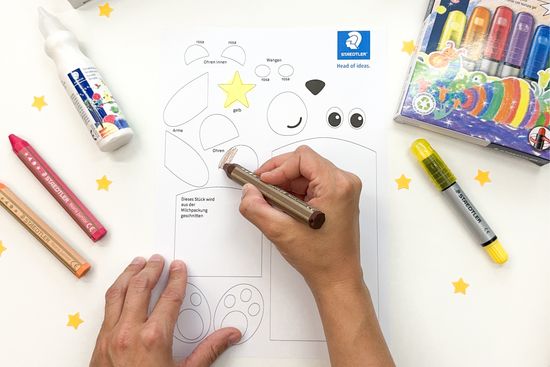 1. Nyomtassuk ki az itt található sablont, majd színezzük ki a maci kezeit, lábait, füleit, és a csillagot. Ezután óvatosan vágjunk ki mindent. A megtisztított tejesdoboz elejéből vágjunk ki egy (a sablonban szereplő) ablakot.