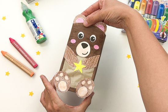 4. Amint megszáradt a festék a dobozon, helyezzük a bézs selyempapírt a tejesdoboz belsejébe, majd ragasszuk fel a maci testrészeit és a csillagot a dobozra.