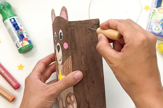 5. Ahhoz, hogy a lámpást rögzíteni tudjuk, egy éles tárgy segítségével óvatosan lyukakat kell szúrnunk a doboz jobb és bal oldalára. Fűzzük át rajta a madzagot, és csomózzuk meg erősen, hogy ki ne csússzon belőle. Ezután helyezzük a LED fényfűzért a maciba, így már el is készült a hihetetlenül aranyos, egyedi lámpásunk.