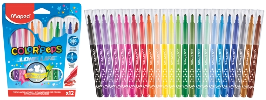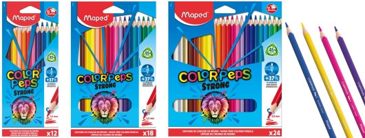 A dekoráláshoz tökéletes választás a MAPED „Color’ Peps Strong” termékcsalád háromszögletű színesceruza készlete. A hagyományos ceruzákhoz képest 37%-kal ellenállóbb, így biztosan nem törik ki a hegye színezés közben. 12, 18 és 24 db-os kiszerelésben elérhető.