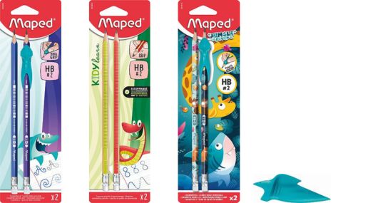 A tanárok által is ajánlott MAPED „Kidy Learn” termékek szórakoztató és játékos formában segítik az írástanulást. A HB keménységű grafitceruzák ergonomikus háromszög formájukkal kényelmes használatot biztosítanak. A cápaformájú levehető ceruzafogó a ceruza helyes tartásának elsajátításában segíti az apró kezeket.