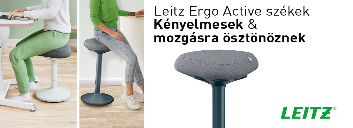 Az új LEITZ Ergo Active székek az egyedülálló Dual Density Foam (DDF) komfortülésnek köszönhetően kényelmes és támogató ülést biztosítanak. Az ülő és álló verzióban elérhető székek magassága könnyedén szabályozható, billenő funkciójuk révén pedig mozgásban tartják a törzs- és lábizmokat az ülőmunka közben is, ezáltal erősítik a hátat és a törzset.