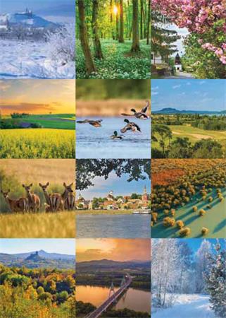 -naptár rész: magyar, angol, német nyelven, magyar  ünnepek  és névnapokkal, napkelte, napnyugta és holdállás  feltüntetésével