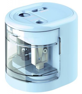 Hegyező, kétlyukú, asztali, elemes, USB töltővel, RAPESCO"PS12-USB", világoskék