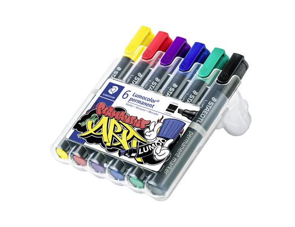 KezdőlapIrodaszerekÍrószerekMarkerekAlkoholos marker készlet, 2-5 mm, vágott, STAEDTLER "Lumocolor® 350", 6 különböző szín