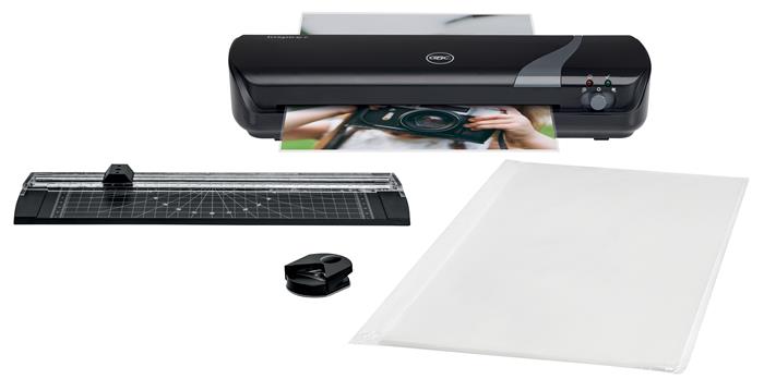A készlet tartalma: 1x GBC Inspire+ A4 laminálógép (fekete), 1x sarokvágó az éles szélek és sarkok levágásához, 1x papírvágó a dokumentumok egyszerű és biztonságos méretre igazításához, 5x laminálófóliából (2x75 mikron) álló kezdőcsomag.