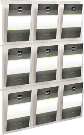 Prospektustartó, fali, A4, 9 rekeszes, HELIT "Placativ", átlátszó