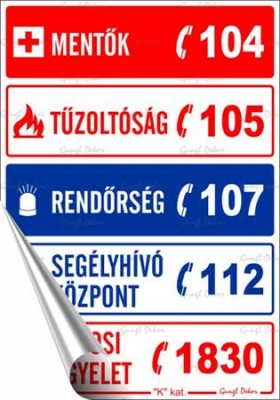 KezdőlapÜzemeltetésLétesítmény üzemeltetésInformációs és tájékoztató jelekInformációs matrica, 11,6x16,6 cm, "Segélyhívószámok"