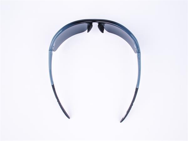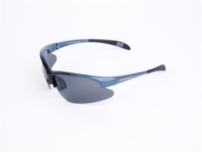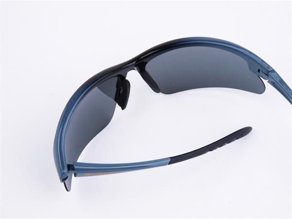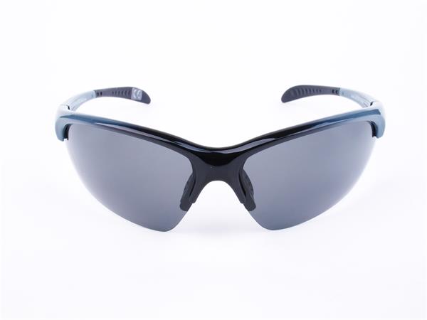 Sportnapszemüveg füstszínű polarizált lencsével, szürke-fekete műanyag kerettel.