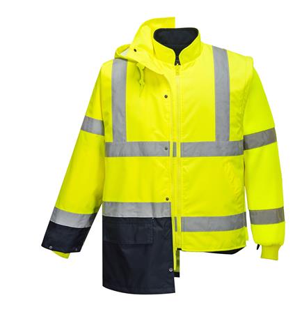 Kiváló ár-érték arányt képviselő 5 az 1-ben jól láthatósági munkavédelmi kabát (kontraszt színekkel). A külső kabáton praktikus tárolózsebek, patentos, állítható mandzsetta és rejtett kapucni található. A ragasztott varratok vízállóságot biztosítanak. A belső kabát levehető, fluoreszkáló polár ujjakkal, két tárolózsebbel és sötét színű kontraszt panelekkel rendelkezik. A kétutas cipzár a gyors és könnyű hozzáférést segíti. A kabát öt különböző funkcióban, akár egész évben viselhető. EN 20471 szabvány szerinti 50 mosásra minősítve.